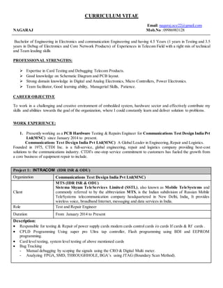 Nagaraj has over 4.5 years of experience in testing and debugging electronics and core network products. He currently works as a PCB Hardware Testing & Repairs Engineer, where he is responsible for testing and repairing various cards. Previously he has worked for multiple companies testing and debugging telecom and networking equipment. He has expertise in areas like schematic diagrams, PCB layout, digital and analog electronics. Nagaraj holds a Bachelor's degree in Electronics and Communication Engineering.
