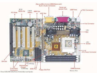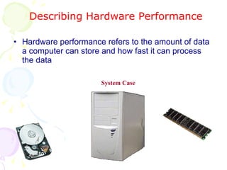 This document summarizes the key components of a computer system. It describes the system unit case and internal components like the motherboard, CPU, memory, and storage drives. It explains how bits and bytes represent data and how components like the control unit, ALU, and registers work together in the CPU's processing cycle. Connection ports on the outside of the system unit and the functions of common components are also outlined.