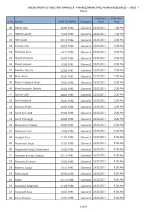The document lists 65 candidates who are scheduled to interview for the position of Assistant Manager of Finance, Marketing, or Human Resources at JMGS in Delhi, India. It provides each candidate's name, date of birth, category (all are general), interview date, and interview time. The interviews are taking place from May 25th to May 26th, 2011, with multiple time slots each day.