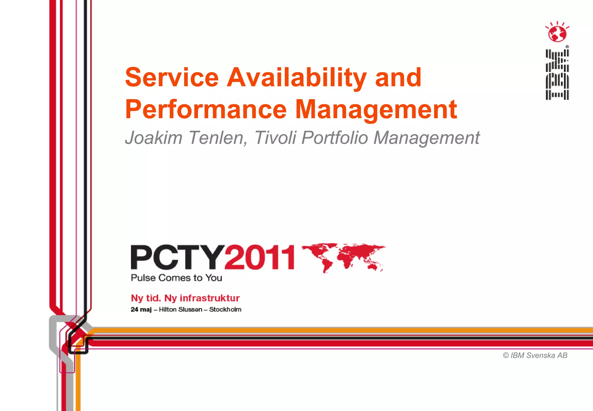 The document discusses IBM's service availability and performance management portfolio. It covers virtualization and cloud computing, application performance management, business service management, and provides a look ahead. Key capabilities highlighted include monitoring performance across virtual infrastructures, transaction tracking to isolate failures, diagnostics to identify root causes, and business service management to prioritize issues by business impact.