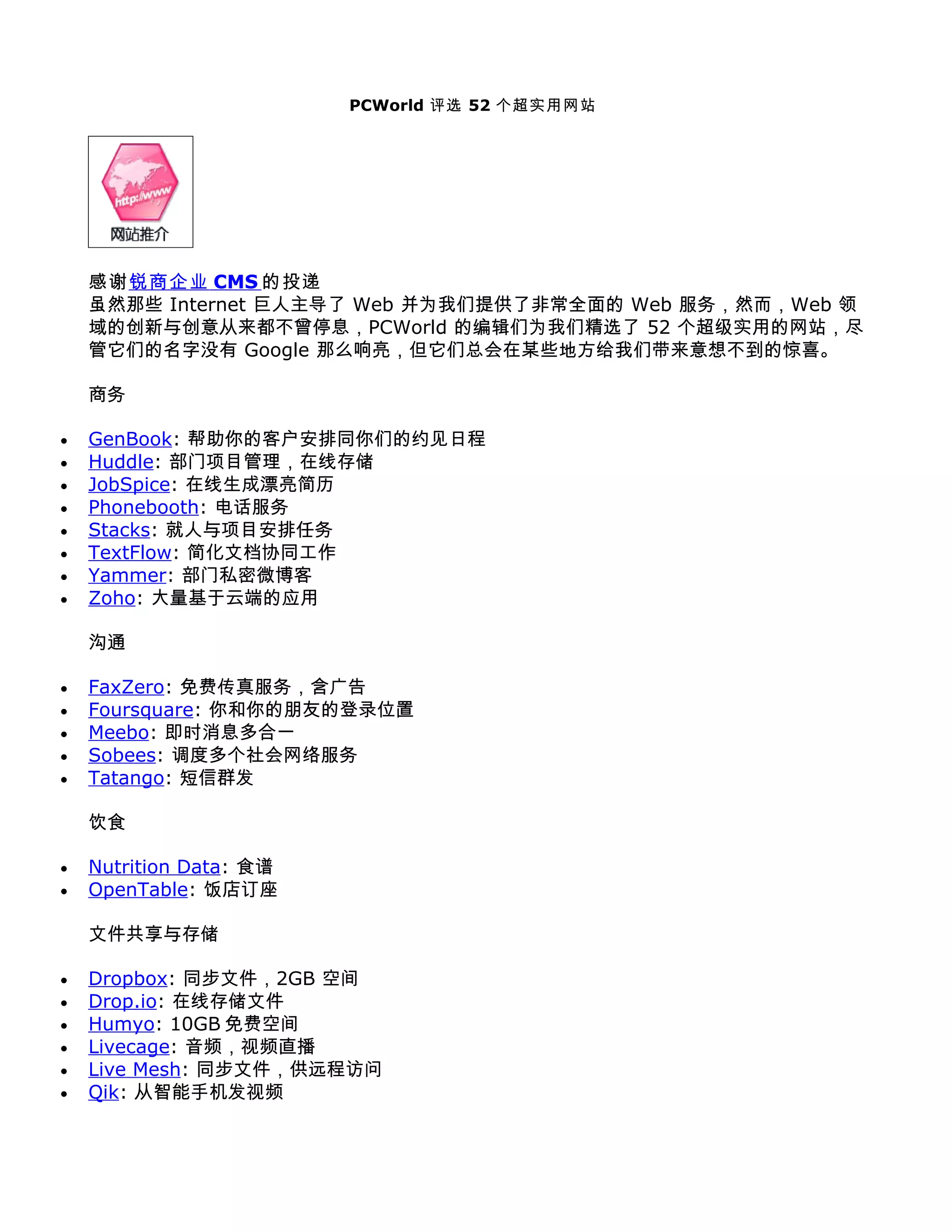 PCWorld评选了52个实用网站,虽然它们不如谷歌响亮,但各具特色并能提供意想不到的服务。网站涵盖商务、沟通、饮食、文件共享、媒体、工作、购物和旅游等多个领域,为用户带来便利与创新。编辑希望读者能发现这些网站的隐藏价值。
