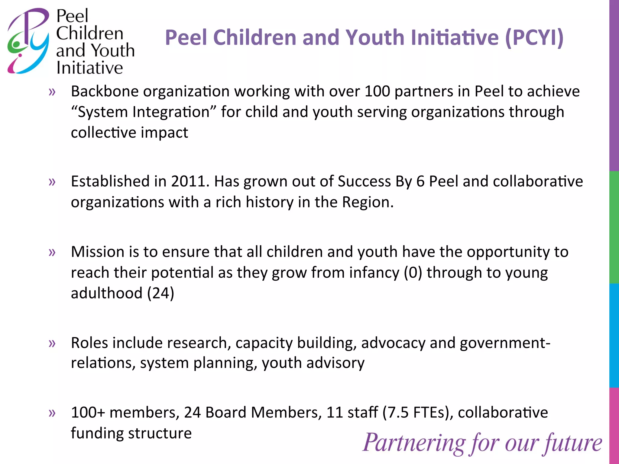 The Peel Children and Youth Initiative (PCYI) aims to support all children and youth in reaching their potential through collaboration with over 100 partners. A study assessed parents' perceptions and experiences regarding formal services and supports, highlighting that immigration status and ethnicity significantly affect service usage, particularly among newcomers. The findings reveal four main themes impacting parents' engagement with services: realities of life in Canada, access and availability of services, relevance and quality, and promotion and engagement.
