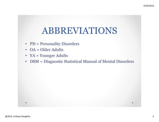 This document discusses personality disorders and aging. It begins by defining personality and outlining the "Big Five" personality traits. It then discusses how personality traits generally change with age, with agreeableness and conscientiousness increasing and extraversion and openness decreasing after age 50. The document outlines the diagnostic criteria for personality disorders and clusters them into groups A, B, and C. It notes several challenges with diagnosing personality disorders in older adults and provides case examples of how different clusters may present. Overall management tips focus on balancing structure with flexibility, validating feelings, and empowering independence.