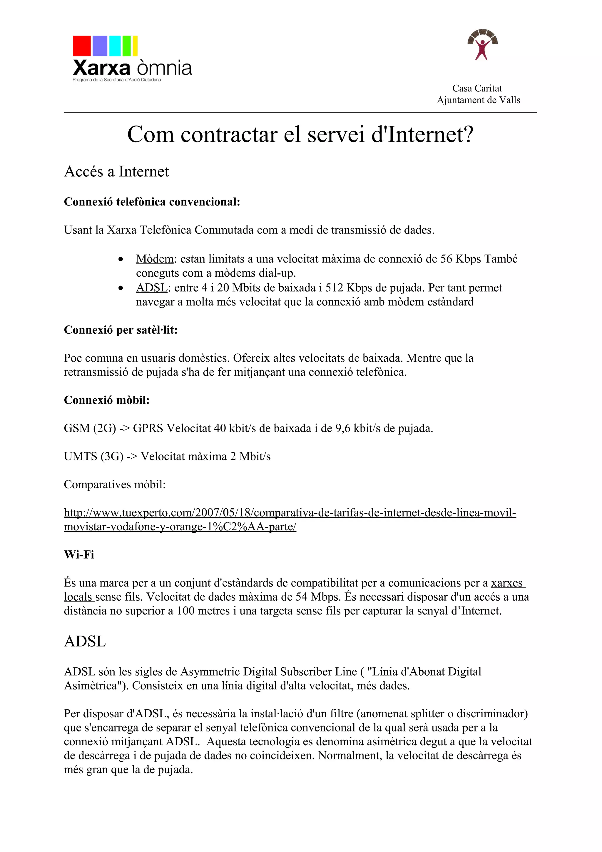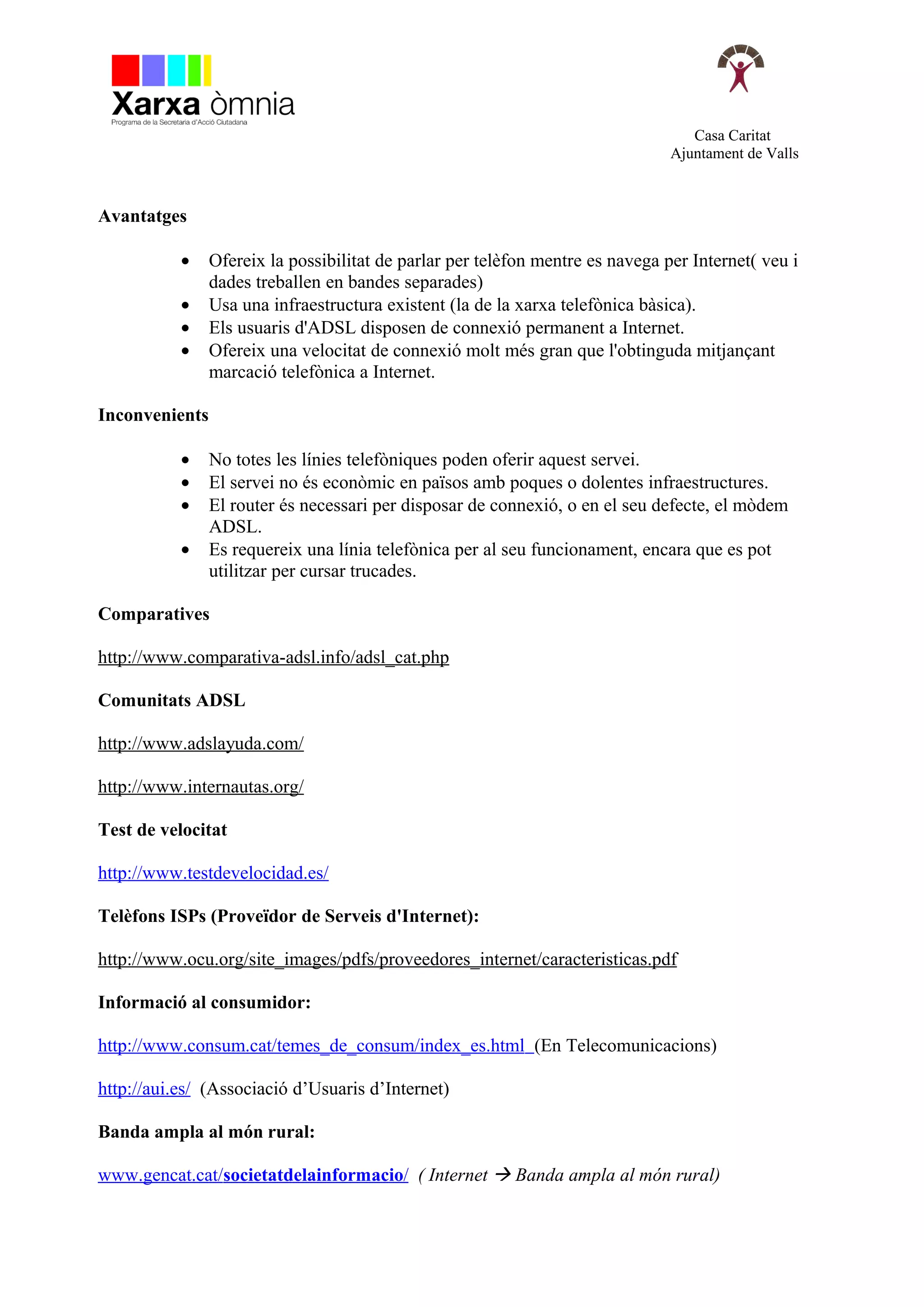 • ADSL: entre 4 i 20 Mbits de baixada i 512 Kbps de pujada. Per tant permet