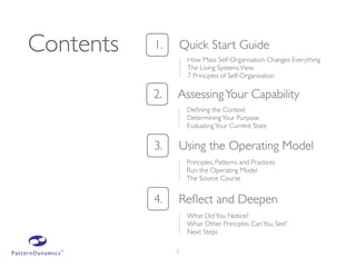 The document is a workbook that provides guidance on creating open, adaptive, and innovative self-organizing groups through the principles of self-organization modeled after living systems. It emphasizes the importance of collective decision-making and the shifting from mechanistic to living systems approaches in addressing complex social and organizational challenges. The workbook includes assessments, reflective questions, and practical exercises for developing skills aligned with the principles of self-organization.
