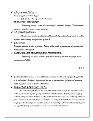 Perception is how individuals organize sensory information to understand their environment. Emotional intelligence involves the ability to understand one's own and other people's emotions to guide thinking and actions. It has five components: self-awareness, managing emotions, self-motivation, empathy, and handling relationships. Emotional intelligence improves personal and professional lives. In personal life, it leads to better relationships, ability to accept change, and a happier life. In professional life, it allows for clearer thinking, better conflict resolution, managing job stress, better customer service, and improved job performance.