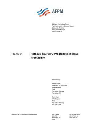 The document discusses how Total's Port Arthur Refinery improved its Advanced Process Control (APC) program by separating the APC and process control organizations, identifying key APC stakeholders, and engaging stakeholders in the design, implementation, and maintenance of APC applications. Key steps included dedicating APC engineers, providing stakeholder training, making APC information readily available, and establishing an APC program philosophy of high visibility and stakeholder accountability. These changes resulted in increased APC utilization rates and productivity improvements.