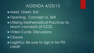 The document outlines a professional development agenda focused on reforming teaching practices in mathematics, emphasizing conceptual understanding versus procedural skills in alignment with CCSS. It encourages collaboration among teachers to implement mathematical practices and develop student engagement through inquiry-based learning and group assessments. The session aims to enhance teacher knowledge that translates into improved student learning outcomes in mathematics.