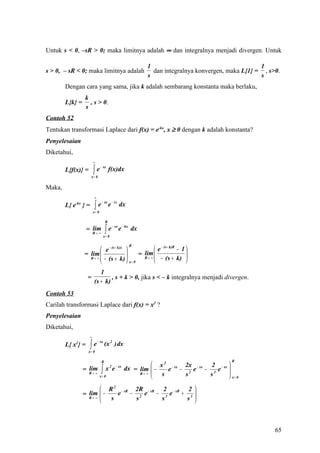 Transformasi Laplace digunakan untuk mengubah fungsi waktu ke domain s. Metode ini bergantung pada transformasi Laplace yang mengubah fungsi f(x) menjadi L{f(x)}. Beberapa contoh transformasi Laplace antara lain untuk fungsi konstan, eksponensial, trigonometri, dan kombinasinya. Transformasi Laplace memungkinkan penyelesaian persamaan diferensial.