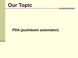 This presentation introduces pushdown automata (PDA). A PDA is a nondeterministic finite state automaton that has an additional stack. It can perform epsilon transitions and manipulate symbols on the stack. PDAs have states, an initial stack symbol, and transitions that can pop, push or replace symbols on the stack. The presentation provides an example of a nondeterministic PDA and traces its execution on an input string to demonstrate how it works. A string is accepted if the PDA reaches a final state after consuming all input, regardless of the stack contents.