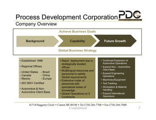 Global Capability Corporation provides engineering, manufacturing, and supply chain management services on a global scale. It has offices across North America, South America, Europe, and Asia to allow for rapid deployment worldwide. The company aims to continue expanding its automotive and non-automotive operations internationally through increased engineering capabilities and multilingual resources. Global Capability takes a strategic approach to operations management, supplier quality, and logistics to efficiently serve its global client base.