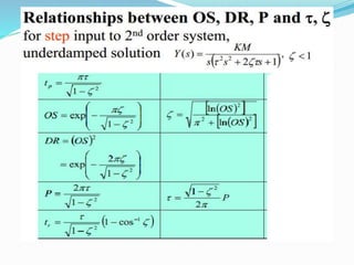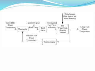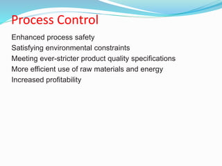 This document discusses process control systems and their components. It describes the main goals of process control as enhancing safety, satisfying environmental constraints, meeting quality specifications, efficiently using resources, and increasing profitability. The key components of a control system are identified as the process, measuring element, controller, and final control element. A block diagram shows a simple closed-loop control system with feedback. Common control system terms are defined, such as deviation variable, error, set point, and negative feedback. Examples of controlled processes include a stirred-tank heater and liquid level control.
