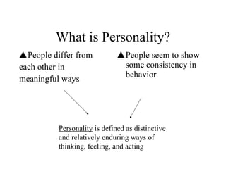 The document discusses different theories of personality including trait, psychoanalytic, humanistic, and social-cognitive theories. Trait theory describes personality in terms of traits like extraversion and neuroticism. Psychoanalytic theory proposes that personality is determined by unconscious forces and defense mechanisms. Humanistic theory views people as inherently good and striving for self-actualization. Social-cognitive theory emphasizes how personal histories and interpretations shape unique personalities.