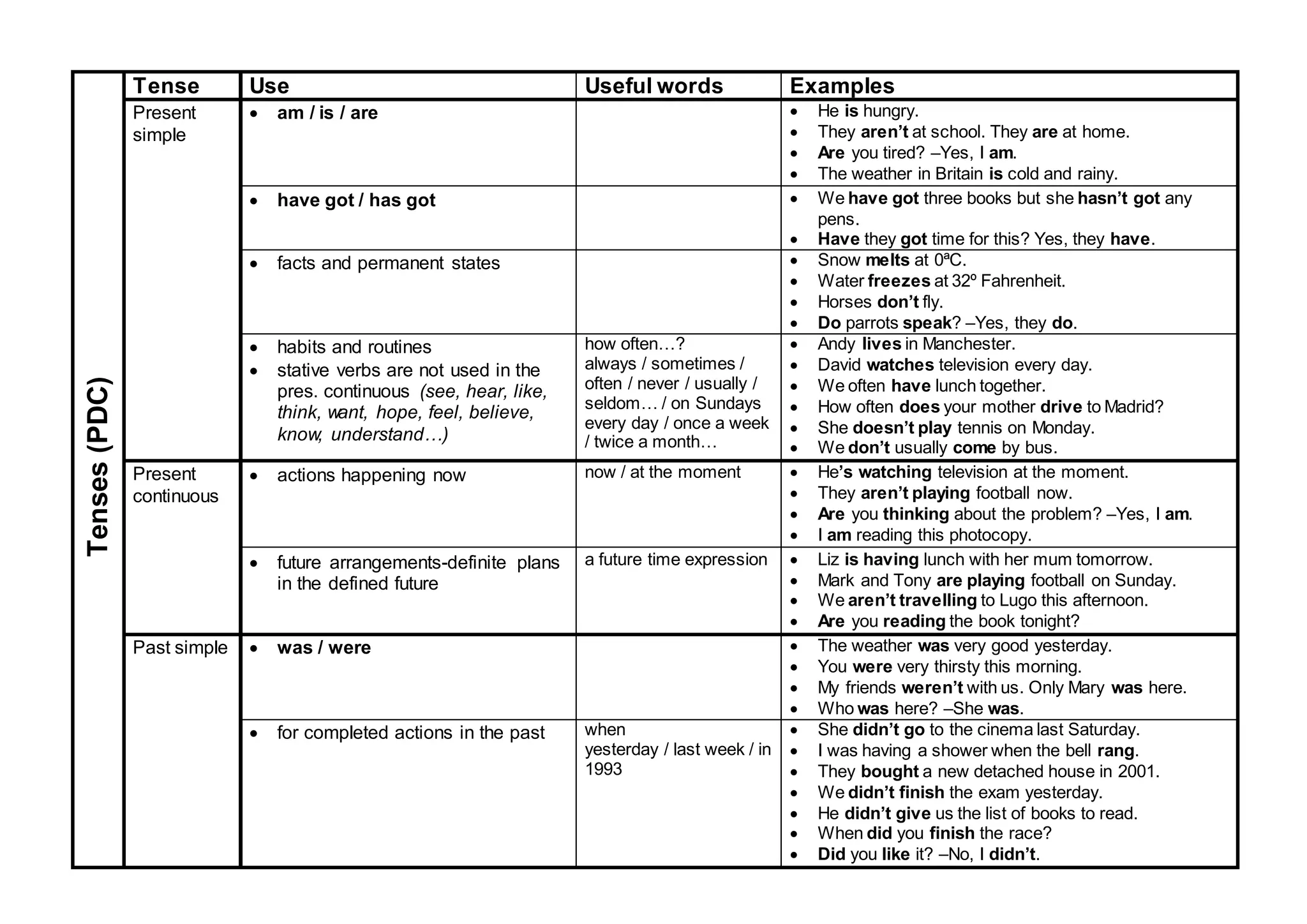 This document summarizes different tenses in English including the present simple, present continuous, and past simple tenses. It provides examples of how to use each tense, including common words used with each tense and when they are typically used. For the present simple, it discusses using it for facts, habits, and routines. For the present continuous, it discusses using it for actions happening now and future arrangements. For the past simple, it discusses using it for completed actions in the past and provides time expressions used with it like yesterday or last week.