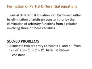 This document discusses partial differential equations (PDEs). It provides examples of how PDEs can be formed by eliminating constants or functions from relations involving multiple variables. It also discusses different types of first-order PDEs and methods for solving them. Several example problems are presented with step-by-step solutions showing how to derive and solve PDEs that model different physical situations. Standard forms and techniques for reducing PDEs to simpler forms are also outlined.
