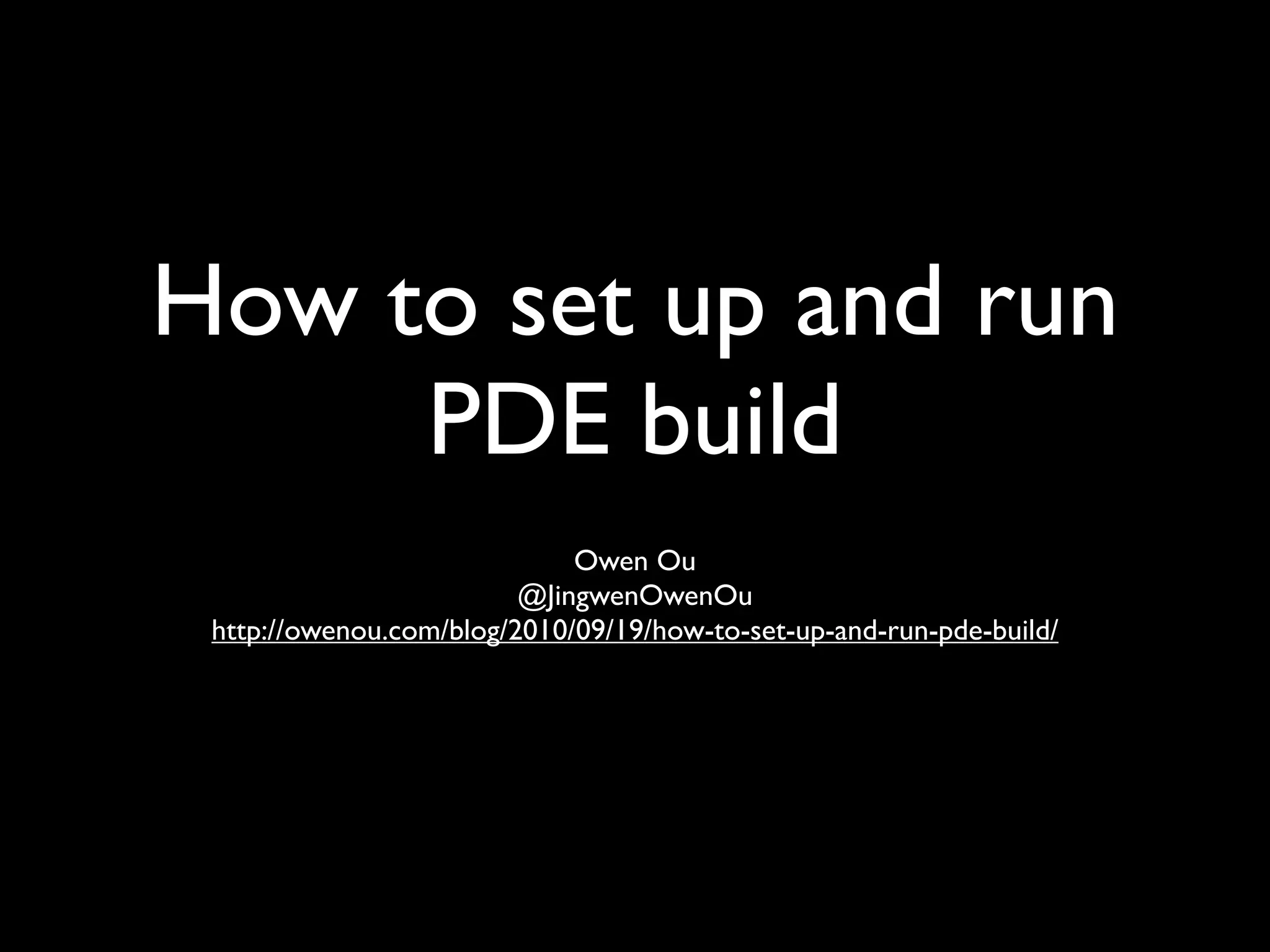 This document describes how to set up and run a PDE (Plug-in Development Environment) build. PDE build allows automating the plug-in build process through command line. It requires setting up a build directory containing the source plugins/features, a target platform directory containing dependency plugins/features, and a build configuration file. The PDE build is then run with a Java command specifying these directories. This allows automatically building plug-ins and features against the dependencies in the target platform.