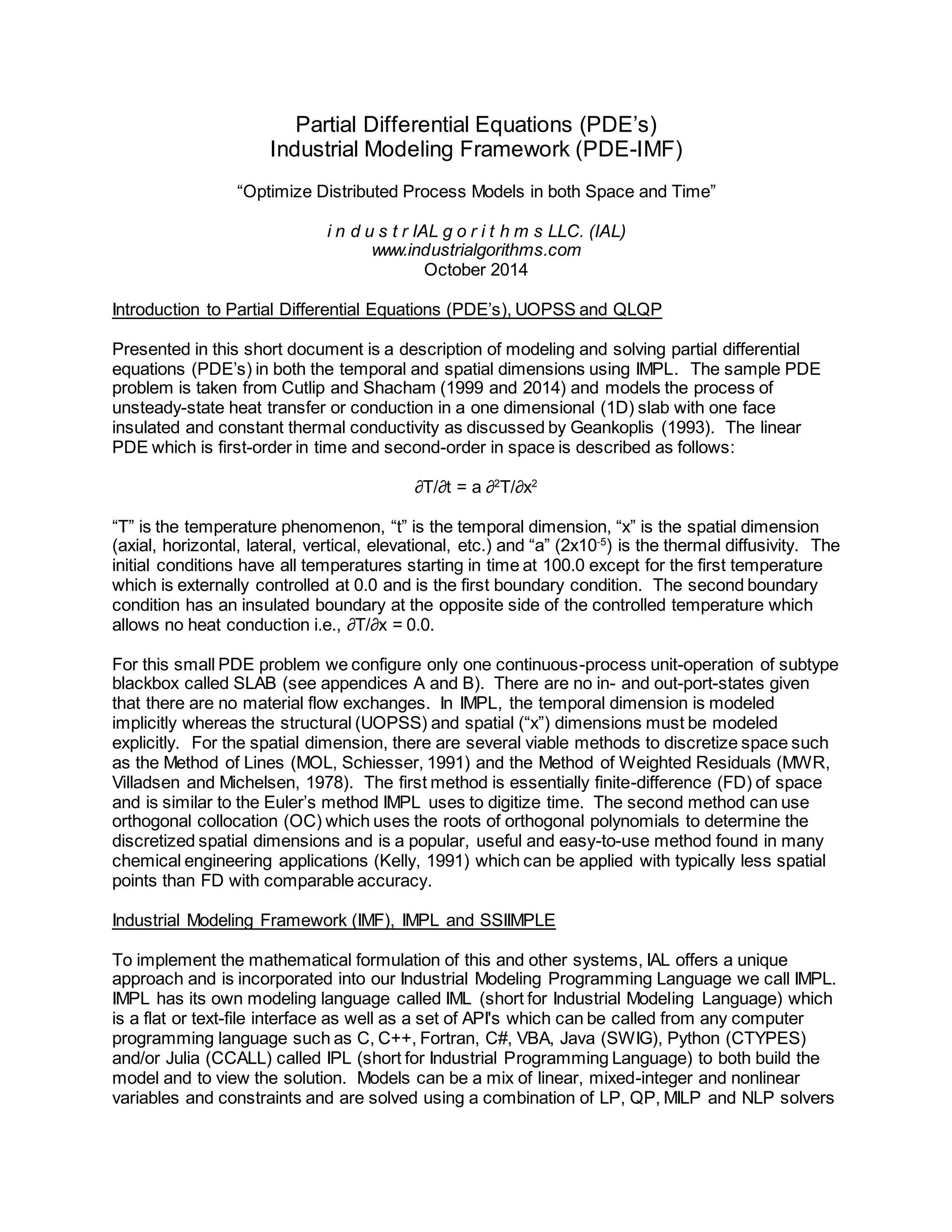 This document discusses modeling and solving partial differential equations (PDEs) using the Industrial Modeling Framework (IMF). It presents a sample 1D heat transfer PDE problem and models it using finite difference (FD) and orthogonal collocation (OC) methods. The results show good agreement between the two methods. IMPL can model both dynamic and spatially distributed problems by discretizing across time and space to obtain algebraic equations that can then be optimized.
