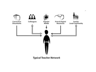 A connected teacher utilizes various online tools and platforms to engage in professional learning networks and collaboration. This includes participating in virtual conferences and unconference events like Teachmeets; using social bookmarking sites, video conferencing, blogs, wikis and forums; listening to educational podcasts; interacting on Twitter; and sharing resources through sites like Flickr and Imagebank. Connected teachers actively read, write and communicate online to enhance their teaching practice through interaction with colleagues globally.