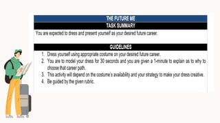 This document provides information and resources for a presentation on personal development and career planning. It includes infographics that can be inserted into slides on topics like identifying career options, the influence of parents and peers, and setting goals. The document discusses how external factors like family, friends, gender, and academic performance can influence one's career choice, and that these external influences interact with internal factors. It also outlines steps to practical career planning, including setting SMART goals, making smaller sub-goals, reviewing plans regularly, and rewarding goal achievement.
