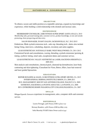 The candidate seeks a stable position at a reputable salon or spa to expand her knowledge and experience in esthetics, build client relationships, and increase sales. She has over 10 years of experience in esthetics, management, and sales roles. Her experience includes positions as a salon manager, lead esthetician, and membership counselor. She has extensive training in esthetics, business management, and sales.