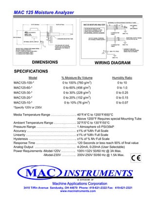The MAC125 Moisture Analyzer is an instrument that can measure absolute humidity at high temperatures up to 1200°F. It uses a solid state sensor to measure the partial pressure of water vapor without chemicals, compressed air, or moving parts. It has various output and installation options and provides accurate humidity measurements for industrial processes.
