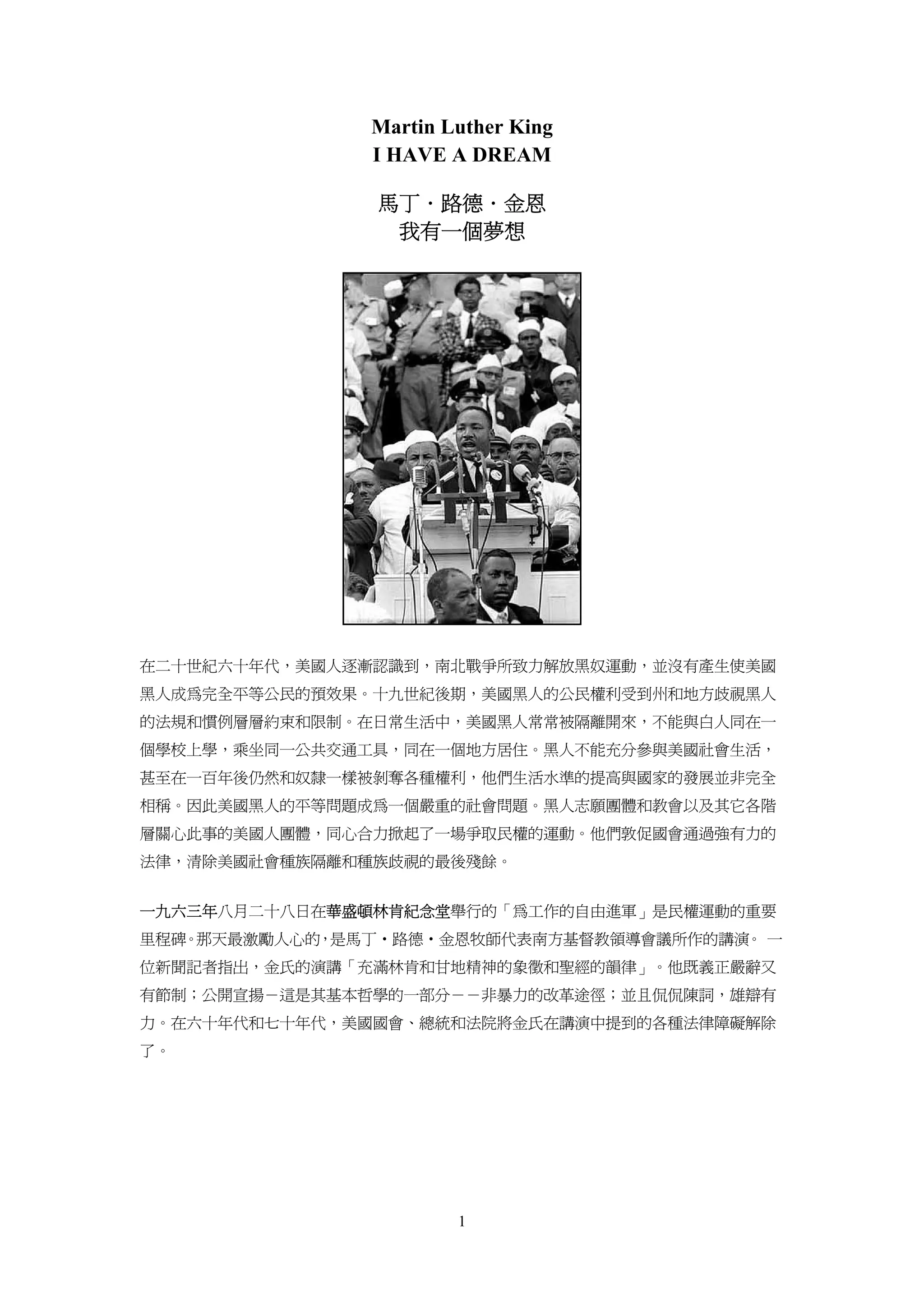 Martin Luther King Jr. delivered his iconic "I Have a Dream" speech in 1963 calling for racial equality and an end to discrimination in the United States. In the speech, he references the Emancipation Proclamation that freed slaves 100 years prior but notes that 100 years later, black Americans still faced segregation and discrimination that crippled their lives. He dreams of a day when all people will be judged not by the color of their skin but by the content of their character.