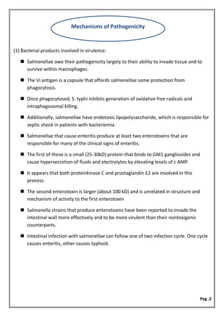 The document provides an overview of various pathogenic bacteria, their characteristics, and the diseases they cause, particularly focusing on Salmonella and Shigella species. It discusses their mechanisms of pathogenicity, laboratory diagnosis, and treatment options for infections such as salmonellosis and shigellosis. Additionally, it includes information on other bacteria such as Klebsiella, Mycoplasma, and Vibrio cholerae, along with their clinical significance and diagnostic methods.