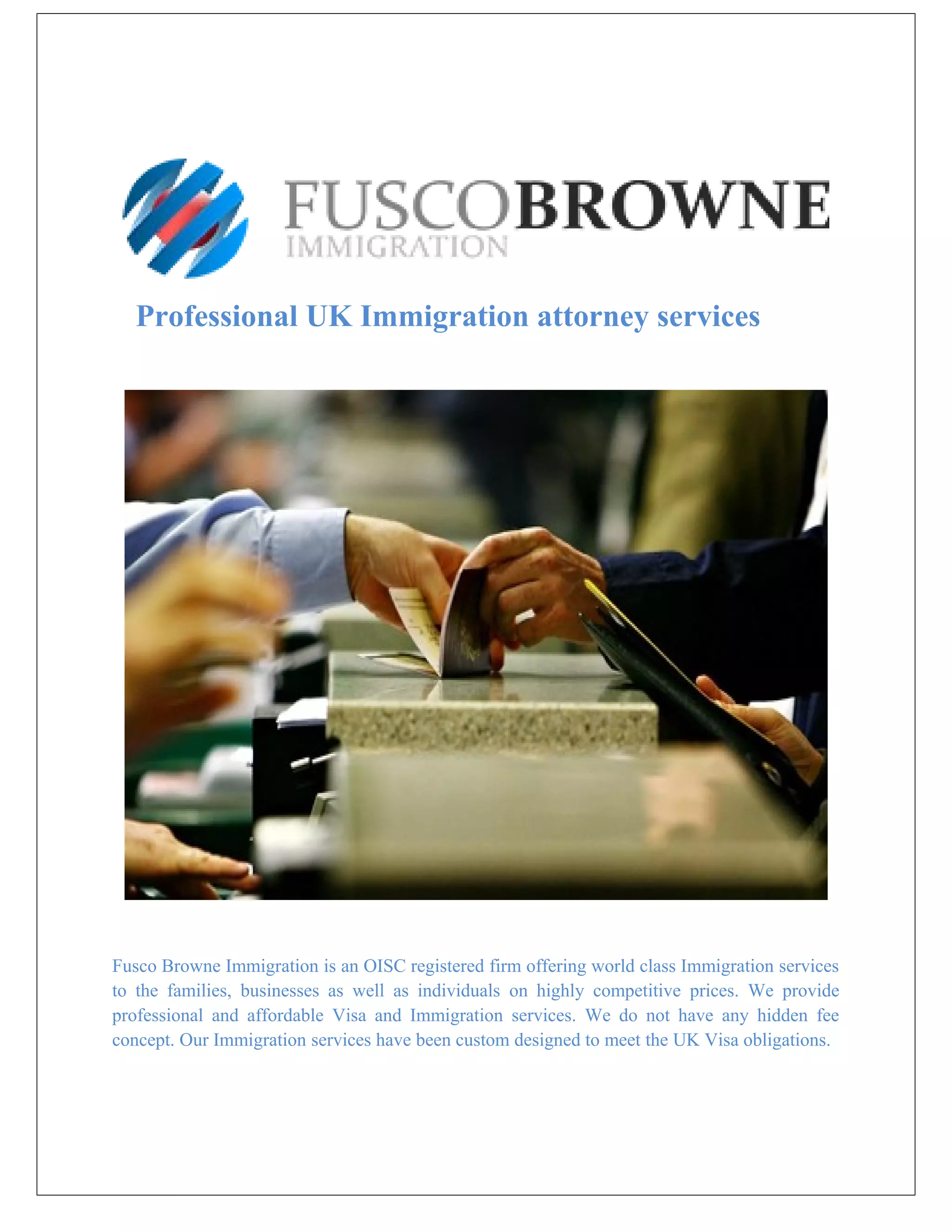 Fusco Browne Immigration is an OISC registered UK immigration attorney firm that offers affordable visa and immigration services designed to meet UK obligations. They have a high success rate and adhere to strict quality standards, focusing on building trust and providing a smooth immigration process. Their UK immigration attorneys are highly qualified and can handle complex immigration law issues. The firm aims to provide up-to-date information on UK visa regulations and help individuals immigrate, work, and settle in the UK.