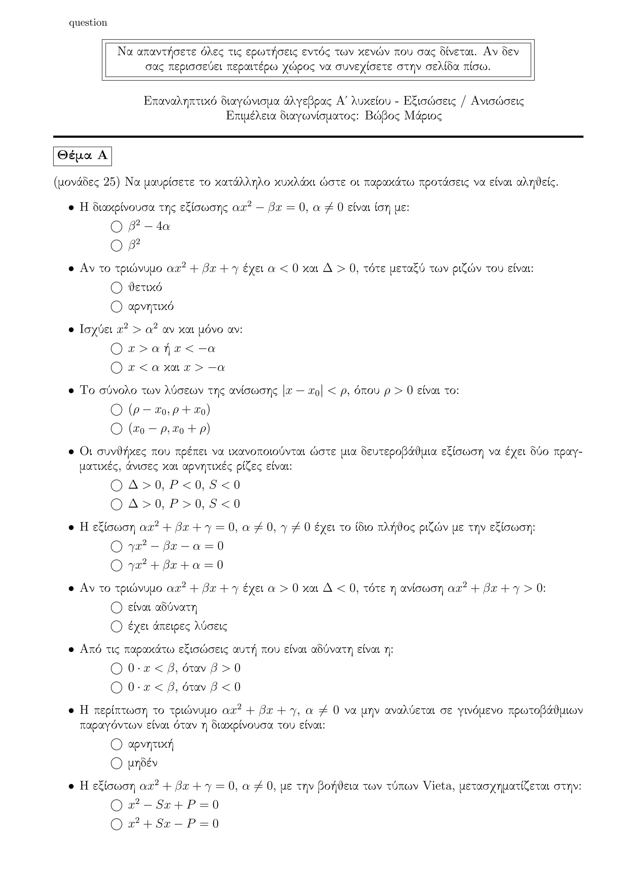 Επαναληπτικό διαγώνισμα άλγεβρας Α΄ λυκείου - Εξισώσεις / Ανισώσεις