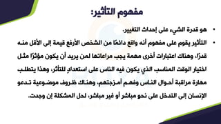 تناقش الوثيقة فن التأثير والإقناع، موضحةً أن التأثير هو القدرة على إحداث تغيير في الأشخاص والقيم. تركز الوثيقة على أساليب الإقناع الفعالة، بما في ذلك استخدام المنطق والعاطفة، ودور المهارات الفنية في توصيل الرسائل بفاعلية. يقدم المحتوى أيضًا استراتيجيات لتوجيه الحوار وتأكيد الثقة بين المتحدث والجمهور.
