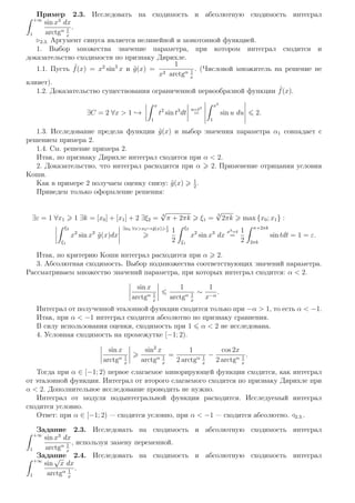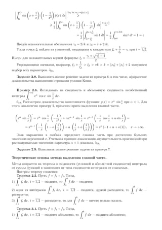 Документ посвящен теме несобственных интегралов, включая определения, критерии сходимости и расходимости, а также применение принципа локализации. Он содержит теоретические сведения и задачи для студентов первого курса, акцентируя внимание на использовании эталонных интегралов и методах сравнения. Приведены различные теоремы и примеры для более глубокого понимания темы.