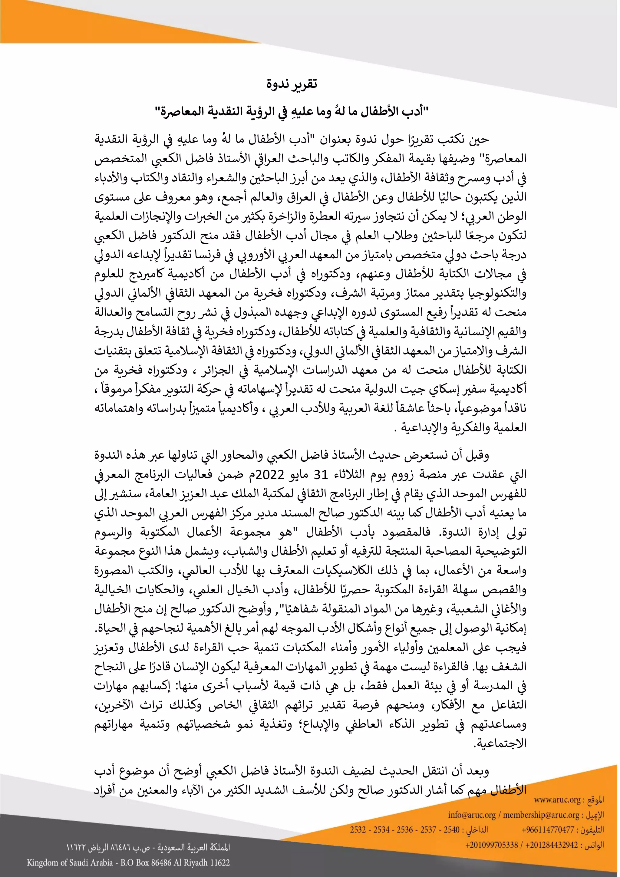 تناولت الندوة أهمية الأدب المخصص للأطفال وتأثيره على تنمية القيم والمفاهيم الاجتماعية. أشار الأستاذ فاضل الكعب إلى دور الأدب في توجيه الأطفال وتعزيز مهاراتهم المعرفية والاجتماعية. كما أكد على ضرورة حضور الأدب في التعليم ودوره الحيوي في تشكيل رؤى الأطفال وثقافاتهم.