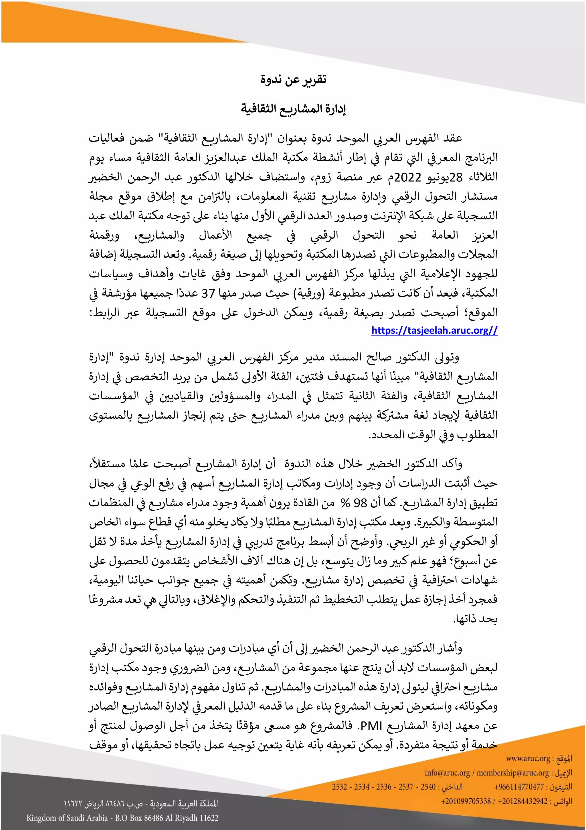 عقدت ندوة تحت عنوان 'إدارة المشاري' في مكتبة الملك عبدالعزيز العامة، حيث تم مناقشة أهمية التحول الرقمي في الفهرسة وإدارة الأعمال الثقافية. استعرض الحضور كيفية توجيه الجهود نحو رقمنة المحتويات الثقافية، وأهمية التخطيط والتنفيذ لضمان نجاح المشاريع. الدكتور عبدالرحمن الخضب أكد على أهمية الإدارة الفعالة للمشاريع لتحقيق الأهداف الاستراتيجية للمؤسسات الثقافية.