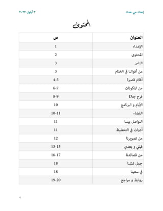ﺣﺪاد ﻣﻲ إﻋﺪاد ىتوحلما اﻟﻌﻨﻮان ص اﻹﻫﺪاء 1 اﳌﺤﺘﻮى 2 اﻟﻨﺎس 3 اﻟﺨﺘﺎم ﰲ أﻗﻮاﻟﻨﺎ ﻣﻦ 3 ﻗﺼرية أﻓﻼم 4-5 اﳌﻜﻮﻧﺎت ﻣﻦ 6-7 Day ﻓﺮح 8-9 اﻟﱪﻧﺎﻣﺞ و اﻷﻳﺎم 10 اﻟﻔﻀﺎء 10-11 ﺑﻴﻨﻨﺎ اﻟﺘﻮاﺻﻞ 11 اﻟﺘﺨﻄﻴﻂ ﰲ أدوات 11 ﺗﺼﻮﻳﺮﻧﺎ ﻣﻦ 12 ﺑﻌﺪي و ﻗﺒﲇ 13-15 ﻗﺼﺎﺋﺪﻧﺎ ﻣﻦ 16-17 متﺜﻠﻨﺎ ﺟﻤﻞ 18 ﺳﻌﻴﻨﺎ ﰲ 18 اﺟﻊﺮﻣ و رواﺑﻂ 19-20 ٢