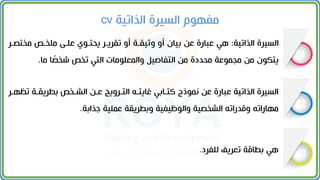 يتناول المستند كيفية إعداد السيرة الذاتية والمقابلات الشخصية، مع توضيح أهمية تقديم المعلومات بوضوح وتنظيمها بشكل جذاب. يستعرض أيضًا خطوات كتابة السيرة الذاتية وأخطاء شائعة ينبغي تجنبها، بالإضافة إلى أهمية الاستعداد للمقابلات من خلال فهم أسئلة شائعة. كما يقدم نصائح حول التعامل مع المعلومات والتوصيات لضمان وضوح المحتوى وفعالية التقديم.