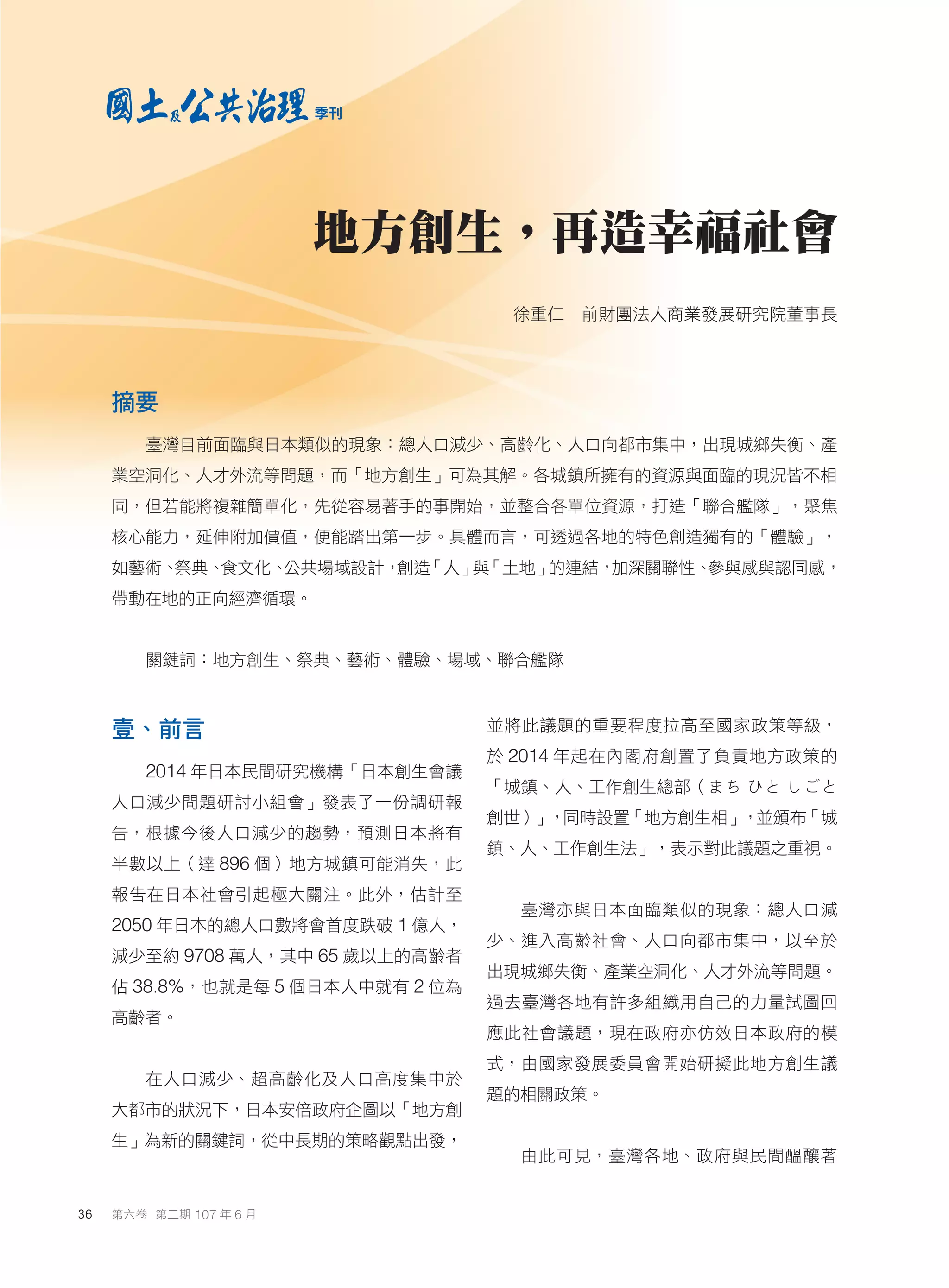 台湾面临人口减少与高龄化等问题,地方创生成为解决方案。通过整合资源、发展地方特色和公共场域设计等方式,促进人与土地的连接,从而推动地方经济发展。成功的地方创生需尊重各地区的独特性,鼓励民间参与,营造可持续的地方文化与经济。