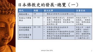 文档概述了日本佛教的历史发展,从佛教传入日本的初期到现代新兴宗教的兴起,涵盖了重要事件、宗派和文化影响。主要分为奈良、平安、镰仓、德川和近代等不同历史阶段,强调了佛教在社会政治及民族文化中的地位。还提及了念佛与唱题的盛行以及佛法护国的概念,这些都成为日本佛教的显著特点。