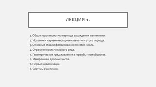 Документ описывает историю математики, начиная с ее зарождения в каменном веке, включая развитие количественных понятий, простейших систем счисления и первых геометрических представлений. Освещаются основные этапы формирования арифметики и алгебры в древних цивилизациях, таких как Египет, Вавилон и Греция, а также их вклад в развитие математических теорий и методов. Включены сведения о системах счисления и особенностях математической практики этих эпох.