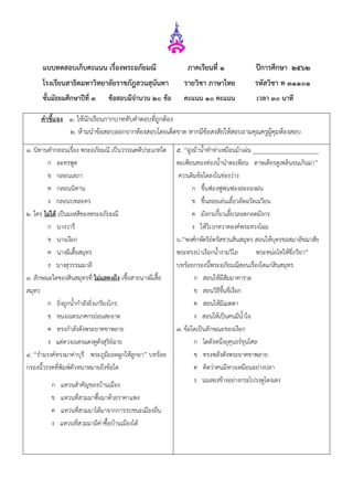 ๑ ปีการศึกษา ๒๕๖๒ โรงเรียนสาธิตมหาวิทยาลัยราชภัฎสวนสุนันทา รายวิชา ภาษาไทย รหัสวิชา ท ๓๑๑๐๑ ชั้นมัธยมศึกษาปีที่ ๓ ข้อสอบมีจานวน ๒๐ ข้อ คะแนน ๑๐ คะแนน เวลา ๓๐ นาที คาชี้แจง ๑. ให้นักเรียนกากบาททับคาตอบที่ถูกต้อง ๒. ห้ามนาข้อสอบออกจากห้องสอบโดยเด็ดขาด หากมีข้อสงสัยให้สอบถามคุณครูผู้คุมห้องสอบ ๑. นิทานคากลอนเรื่อง พระอภัยมณี เป็นวรรณคดีประเภทใด ก ละครพูด ข กลอนเสภา ค กลอนนิทาน ง กลอนบทละคร ๒. ใคร ไม่ได้ เป็นมเหสีของพระอภัยมณี ก นางวารี ข นางเงือก ค นางผีเสื้อสมุทร ง นางสุวรรณมาลี ๓. ลักษณะใดของสินสมุทรที่ ไม่แสดงถึง เชื้อสายนางผีเสื้อ สมุทร ก ยิ่งถูกน้ากาลังยิ่งเกรียงไกร ข ขนงเนตรเกศกรอ่อนสะอาด ค ทรงกาลังดังพระยาคชาพลาย ง แต่ดวงเนตรแดงดูดังสุริย์ฉาย ๔. “ธามรงค์ทรงมาค่าบุรี พระภูมีถอดผูกให้ลูกยา” บทร้อย กรองนี้วรรคที่พิมพ์ตัวหนาหมายถึงข้อใด ก แหวนสาคัญของบ้านเมือง ข แหวนที่สวมมาซื้อมาด้วยราคาแพง ค แหวนที่สวมมาได้มาจากการรบชนะเมืองอื่น ง แหวนที่สวมมามีค่าซื้อบ้านเมืองได้ ๕. “ฝูงม้าน้าทาท่าเหมือนม้าเผ่น _____________________ ตะเพียนทองท่องน้านาตะเพียน ดาษเดียรดูเพลินจนเกินมา” ควรเติมข้อใดลงในช่องว่าง ก ขึ้นฟ่องฟูพ่นฟองละอองฝน ข ขึ้นลอยเล่นเลี้ยวลัดฉวัดเฉวียน ค มังกรเกี้ยวเลี้ยวลอดกอดมังกร ง ให้วิเวกหวาดองค์พระทรงโฉม ๖.“พงศ์กษัตริย์ตรัสชวนสินสมุทร สอนให้บุตรขอสมาอัชฌาสัย พระทรงบ่าเงือกน้างามวิไล พระหน่อไทให้ขี่ภริยา” บทร้อยกรองนี้พระอภัยมณีสอนเรื่องใดแก่สินสมุทร ก สอนให้มีสัมมาคารวะ ข สอนวิธีขึ้นขี่เงือก ค สอนให้มีเมตตา ง สอนให้เป็นคนมีน้าใจ ๗. ข้อใดเป็นลักษณะของเงือก ก โตดังหนึ่งยุคุนธร์ขุนไศล ข ทรงพลังดังพระยาคชาพลาย ค คิดว่าคนมีหางเหมือนอย่างปลา ง นมสองข้างอย่างกระโปรงดูโตงเตง