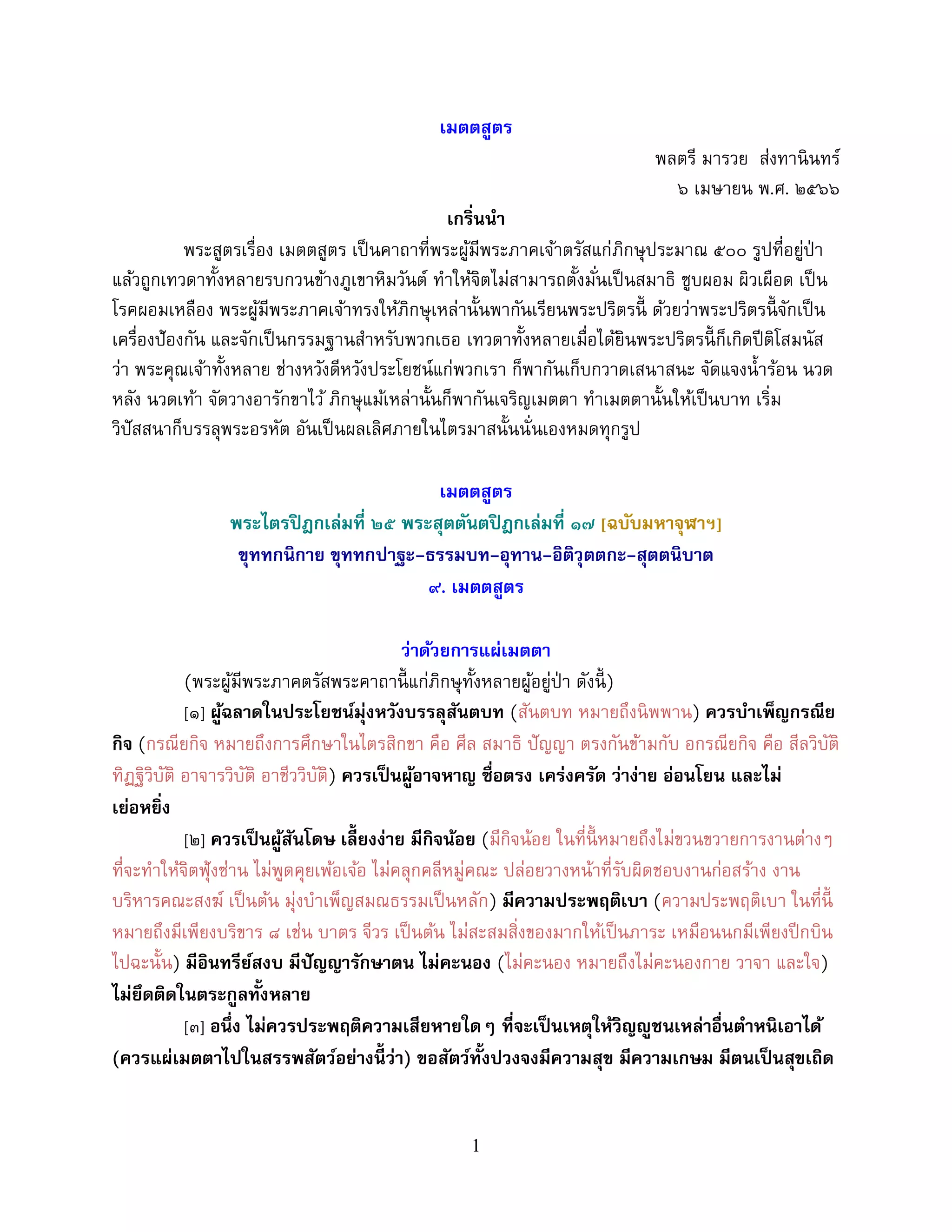 พระสูตรเรื่อง เมตตสูตร เป็นคาถาที่พระผู้มีพระภาคเจ้าตรัสแก่ภิกษุประมาณ ๕๐๐ รูปที่อยู่ป่าแล้วถูกเทวดาทั้งหลายรบกวนข้างภูเขาหิมวันต์ ทำให้จิตไม่สามารถตั้งมั่นเป็นสมาธิ ซูบผอม ผิวเผือด เป็นโรคผอมเหลือง พระผู้มีพระภาคเจ้าทรงให้ภิกษุเหล่านั้นพากันเรียนพระปริตรนี้ ด้วยว่าพระปริตรนี้จักเป็นเครื่องป้องกัน และจักเป็นกรรมฐานสำหรับพวกเธอ เทวดาทั้งหลายเมื่อได้ยินพระปริตรนี้ก็เกิดปีติโสมนัสว่า พระคุณเจ้าทั้งหลาย ช่างหวังดีหวังประโยชน์แก่พวกเรา ก็พากันเก็บกวาดเสนาสนะ จัดแจงน้ำร้อน นวดหลัง นวดเท้า จัดวางอารักขาไว้ ภิกษุแม้เหล่านั้นก็พากันเจริญเมตตา ทำเมตตานั้นให้เป็นบาท เริ่มวิปัสสนาก็บรรลุพระอรหัต อันเป็นผลเลิศภายในไตรมาสนั้นนั่นเองหมดทุกรูป