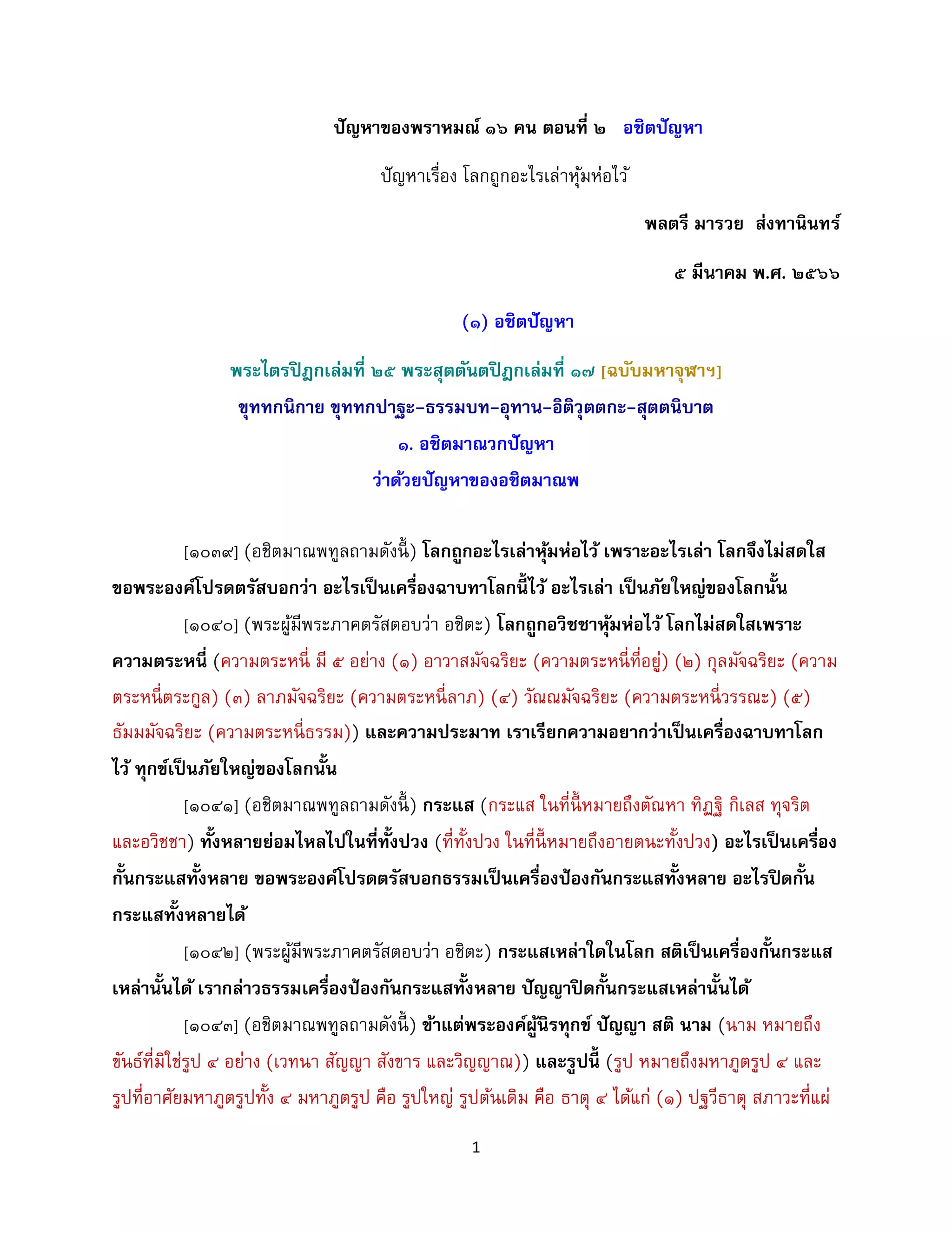 ตอนที่ ๒ อชิตปัญหา ปัญหาเรื่อง โลกถูกอะไรเล่าหุ้มห่อไว้ พลตรี มารวย ส่งทานินทร์ ๕ มีนาคม พ.ศ. ๒๕๖๖ (๑) อชิตปัญหา พระไตรปิฎกเล่มที่ ๒๕ พระสุตตันตปิฎกเล่มที่ ๑๗ [ฉบับมหาจุฬาฯ] ขุททกนิกาย ขุททกปาฐะ-ธรรมบท-อุทาน-อิติวุตตกะ-สุตตนิบาต ๑. อชิตมาณวกปัญหา ว่าด้วยปัญหาของอชิตมาณพ [๑๐๓๙] (อชิตมาณพทูลถามดังนี้ ) โลกถูกอะไรเล่าหุ้มห่อไว้ เพราะอะไรเล่า โลกจึงไม่สดใส ขอพระองค์โปรดตรัสบอกว่า อะไรเป็นเครื่องฉาบทาโลกนี้ ไว้ อะไรเล่า เป็นภัยใหญ่ของโลกนั้น [๑๐๔๐] (พระผู้มีพระภาคตรัสตอบว่า อชิตะ) โลกถูกอวิชชาหุ้มห่อไว้ โลกไม่สดใสเพราะ ความตระหนี่ (ความตระหนี่ มี ๕ อย่าง (๑) อาวาสมัจฉริยะ (ความตระหนี่ที่อยู่) (๒) กุลมัจฉริยะ (ความ ตระหนี่ตระกูล) (๓) ลาภมัจฉริยะ (ความตระหนี่ลาภ) (๔) วัณณมัจฉริยะ (ความตระหนี่วรรณะ) (๕) ธัมมมัจฉริยะ (ความตระหนี่ธรรม)) และความประมาท เราเรียกความอยากว่าเป็นเครื่องฉาบทาโลก ไว้ ทุกข์เป็นภัยใหญ่ของโลกนั้น [๑๐๔๑] (อชิตมาณพทูลถามดังนี้ ) กระแส (กระแส ในที่นี้ หมายถึงตัณหา ทิฏฐิ กิเลส ทุจริต และอวิชชา) ทั้งหลายย่อมไหลไปในที่ทั้งปวง (ที่ทั้งปวง ในที่นี้ หมายถึงอายตนะทั้งปวง) อะไรเป็นเครื่อง กั้นกระแสทั้งหลาย ขอพระองค์โปรดตรัสบอกธรรมเป็นเครื่องป้องกันกระแสทั้งหลาย อะไรปิดกั้น กระแสทั้งหลายได้ [๑๐๔๒] (พระผู้มีพระภาคตรัสตอบว่า อชิตะ) กระแสเหล่าใดในโลก สติเป็นเครื่องกั้นกระแส เหล่านั้นได้ เรากล่าวธรรมเครื่องป้องกันกระแสทั้งหลาย ปัญญาปิ ดกั้นกระแสเหล่านั้นได้ [๑๐๔๓] (อชิตมาณพทูลถามดังนี้ ) ข้าแต่พระองค์ผู้นิรทุกข์ ปัญญา สติ นาม (นาม หมายถึง ขันธ์ที่มิใช่รูป ๔ อย่าง (เวทนา สัญญา สังขาร และวิญญาณ)) และรูปนี้ (รูป หมายถึงมหาภูตรูป ๔ และ รูปที่อาศัยมหาภูตรูปทั้ง ๔ มหาภูตรูป คือ รูปใหญ่ รูปต้นเดิม คือ ธาตุ ๔ ได้แก่ (๑) ปฐวีธาตุ สภาวะที่แผ่
