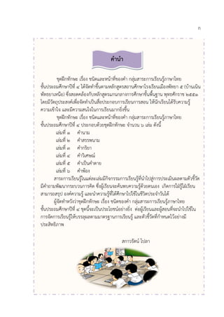 กลุ่มสาระการเรียนรู้ภาษาไทย ชั้นประถมศึกษาปีที่ ๔ ได้จัดทาขึ้นตามหลักสูตรสถานศึกษาโรงเรียนเมืองพัทยา ๕ (บ้านเนิน พัทธยาเหนือ) ซึ่งสอดคล้องกับหลักสูตรแกนกลางการศึกษาขั้นพื้นฐาน พุทธศักราช ๒๕๕๑ โดยมีวัตถุประสงค์เพื่อจัดทาเป็นสื่อประกอบการเรียนการสอน ให้นักเรียนได้รับความรู้ ความเข้าใจ และมีความสนใจในการเรียนมากยิ่งขึ้น ชุดฝึกทักษะ เรื่อง ชนิดและหน้าที่ของคา กลุ่มสาระการเรียนรู้ภาษาไทย ชั้นประถมศึกษาปีที่ ๔ ประกอบด้วยชุดฝึกทักษะ จานวน ๖ เล่ม ดังนี้ เล่มที่ ๑ คานาม เล่มที่ ๒ คาสรรพนาม เล่มที่ ๓ คากริยา เล่มที่ ๔ คาวิเศษณ์ เล่มที่ ๕ คาเป็นคาตาย เล่มที่ ๖ คาพ้อง สาระการเรียนรู้ในแต่ละเล่มมีกิจกรรมการเรียนรู้ที่นาไปสู่การประเมินผลตามตัวชี้วัด มีคาถามพัฒนากระบวนการคิด ซึ่งผู้เรียนจะค้นพบความรู้ด้วยตนเอง, เกิดการใฝ่รู้ใฝ่เรียน สามารถสรุป องค์ความรู้ และนาความรู้ที่ได้ศึกษาไปใช้ในชีวิตประจาวันได้ ผู้จัดทาหวังว่าชุดฝึกทักษะ เรื่อง ชนิดของคา กลุ่มสาระการเรียนรู้ภาษาไทย ชั้นประถมศึกษาปีที่ ๔ ชุดนี้จะเป็นประโยชน์อย่างยิ่ง ต่อผู้เรียนและผู้สอนที่จะนาไปใช้ใน การจัดการเรียนรู้ให้บรรลุผลตามมาตรฐานการเรียนรู้ และตัวชี้วัดที่กาหนดไว้อย่างมี ประสิทธิภาพ สกาวรัตน์ โปลา ก คำนำ