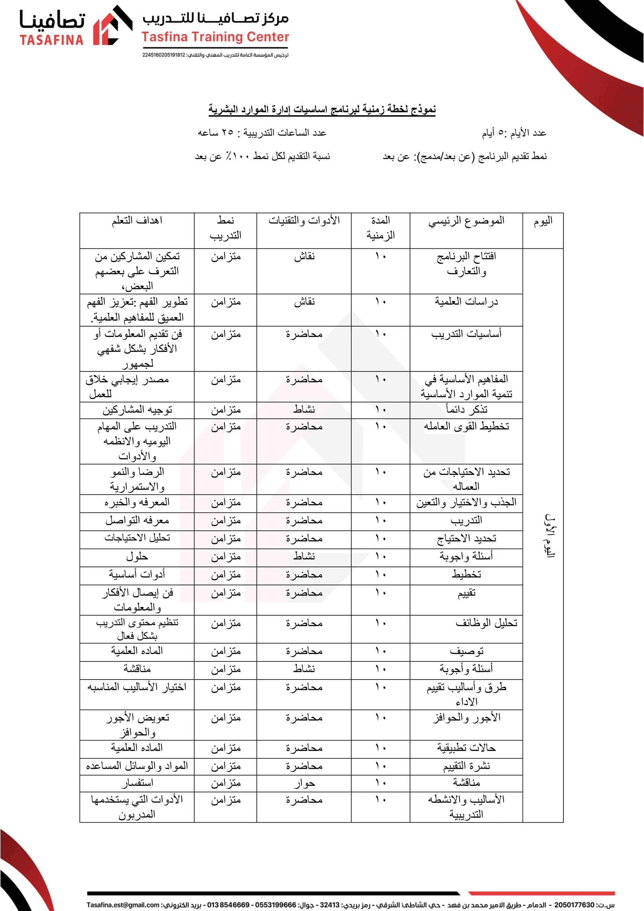 يتناول البرنامج التدريبي لإدارة الموارد البشرية على مدى خمسة أيام مجموعة من المواضيع الأساسية التي تشمل تطوير المهارات الأساسية والتفاعل مع المشاركين وتحديد الاحتياجات التدريبية. يتضمن البرنامج مجموعة متنوعة من الأنشطة والمحاضرات المتزامنة التي تهدف إلى تعزيز الفهم والممارسات الفعالة في التدريب والتعلم. كما يركز البرنامج على كيفية تقييم الأداء وتحفيز الأفراد من خلال بيئة تدريبية إيجابية.