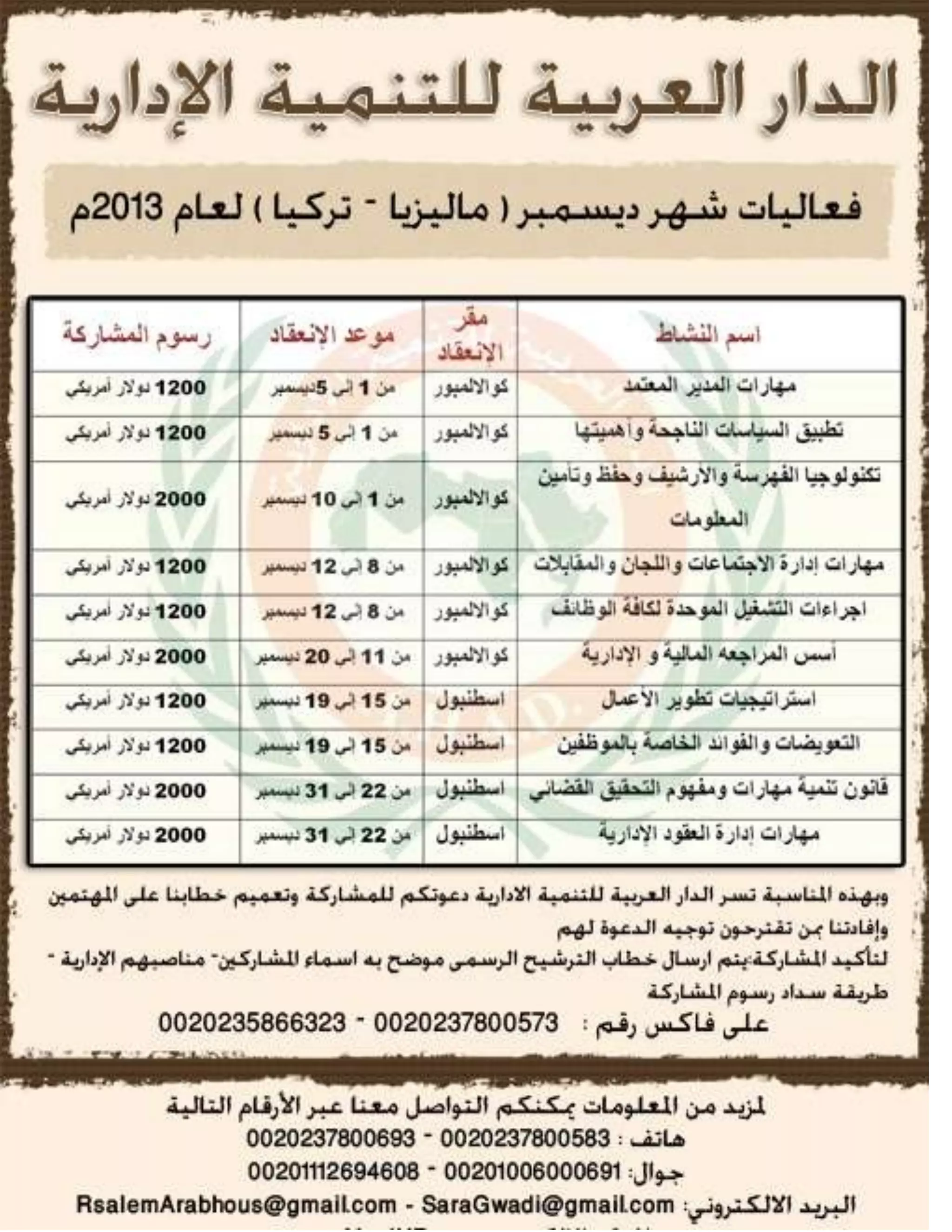 فعاليات الدار العربية للتنمية الإدارية لشهر ديسمبر (ماليزيا – تركيا ) لعام 2013م DOCX