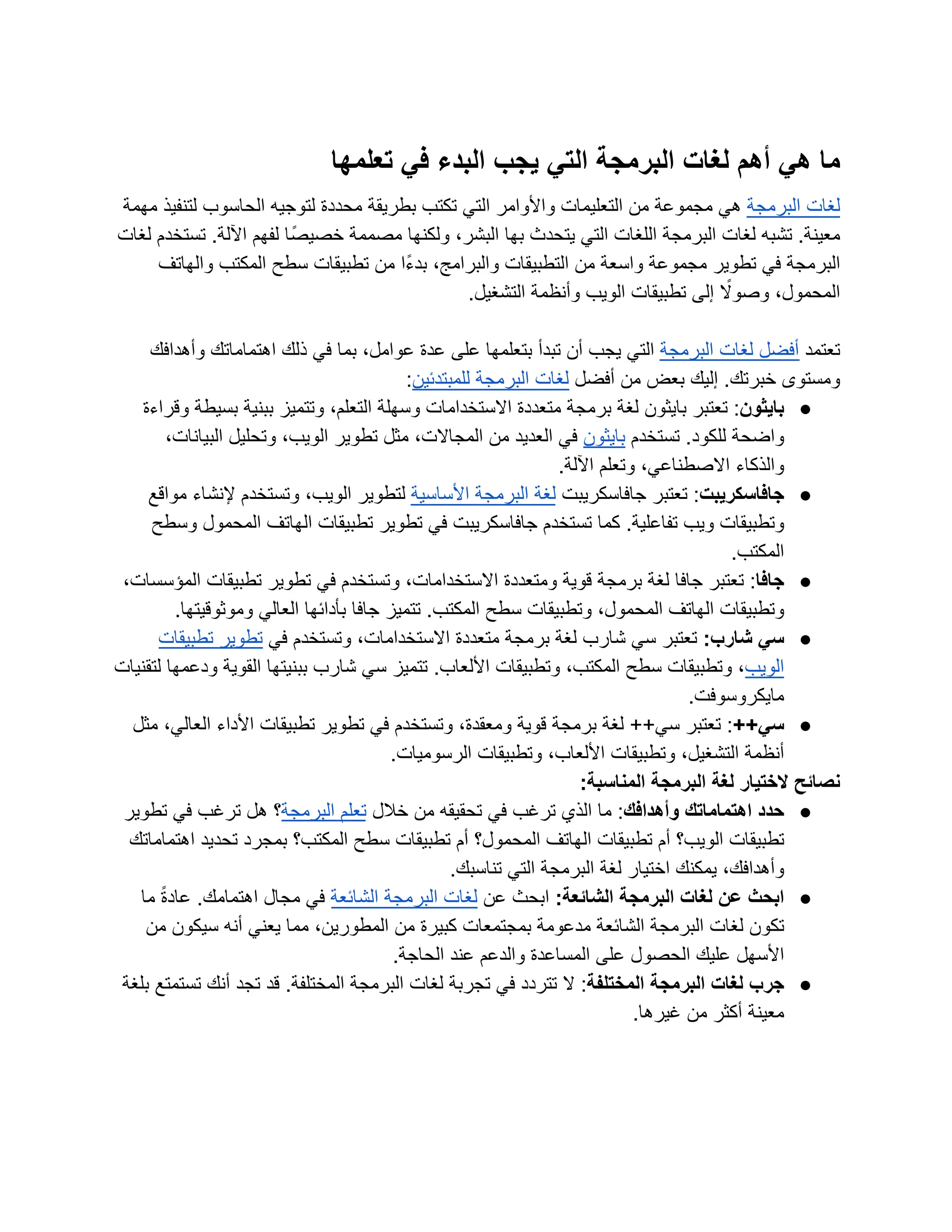 لغات البرمجة هي مجموعة من التعليمات والأوامر التي تكتب بطريقة محددة لتوجيه الحاسوب لتنفيذ مهمة معينة. تشبه لغات البرمجة اللغات التي يتحدث بها البشر، ولكنها مصممة خصيصًا لفهم الآلة. تستخدم لغات البرمجة في تطوير مجموعة واسعة من التطبيقات والبرامج، بدءًا من تطبيقات سطح المكتب والهاتف المحمول، وصولًا إلى تطبيقات الويب وأنظمة التشغيل.