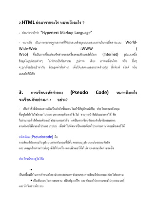 ? - ย่อมาจากคาว่า “Hypertext Markup Language” - หมายถึง เป็นภาษามาตรฐานสากลที่ใช้นาเสนอข้อมูลแบบผสมผสานในการสื่อสารแบบ World- Wide-Web :WWW ( Web) ซึ่งเป็นการเชื่อมต่อเครือข่ายของเครื่องคอมพิวเตอร์ทั่วโลก (Internet) รูปแบบหนึ่ง ข้อมูลในรูปแบบต่างๆ ไม่ว่าจะเป็นข้อความ รูปภาพ เสียง ภาพเคลื่อนไหว หรือ อื่นๆ จะถูกเชื่อมโยงเข้าหากัน ด้วยชุดคาสั่งต่างๆ เพื่อให้แสดงผลออกมาคล้ายกับ สิ่งพิมพ์ สไลด์ หรือ แบบมัลติมีเดีย 3. การเขียนรหัสจาลอง (Pseudo Code) หมายถึงอะไร จงเขียนตัวอย่างมา 1 อย่าง? - เป็นคำสั่งที่จำลองควำมคิดเป็นลำดับขั้นตอนโดยใช้สัญลักษณ์เป็น ประโยคภำษำอังกฤษ ซึ่งซูโดโค้ดไม่ใช่ภำษำโปรแกรมทำงคอมพิวเตอร์จึงไม่ สำมำรถนำไปประมวลผลได้ คือ ไม่สำมำรถสั่งให้คอมพิวเตอร์ทำงำนตำมคำสั่ง แต่เป็นกำรเขียนจำลองคำสั่งจริงแบบย่อๆ ตำมอัลกอริทึมของโปรแกรมระบบ เพื่อนำไปพัฒนำเป็นกำรเขียนโปรแกรมภำษำคอมพิวเตอร์ได้ รหัสเทียม (Pseudocode) คือ กำรเขียนโปรแกรมในรูปแบบภำษำอังกฤษที่มีขั้นตอนและรูปแบบแน่นอนกะทัดรัด และมองดูคล้ำยภำษำระดับสูงที่ใช้กับเครื่องคอมพิวเตอร์ซึ่งไม่เจำะจงภำษำใดภำษำหนึ่ง ประโยชน์ของซูโดโค้ด • เป็นเครื่องมือในกำรกำหนดโครงร่ำงกระบวนกำรทำงำนของกำรเขียนโปรแกรมแต่ละโปรแกรม • เป็นต้นแบบในกำรทบทวน ปรับปรุงแก้ไข และพัฒนำโปรแกรมของโปรแกรมเมอร์ และนักวิเครำะห์ระบบ