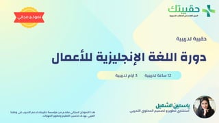 تهدف هذه الحقيبة التدريبية إلى تعزيز المهارات اللغوية المهنية باللغة الإنجليزية، مع التركيز على المفردات والتعابير والتراكيب المستخدمة في مواقف العمل اليومية، بما يرفع كفاءة التواصل داخل بيئة العمل وخارجها.