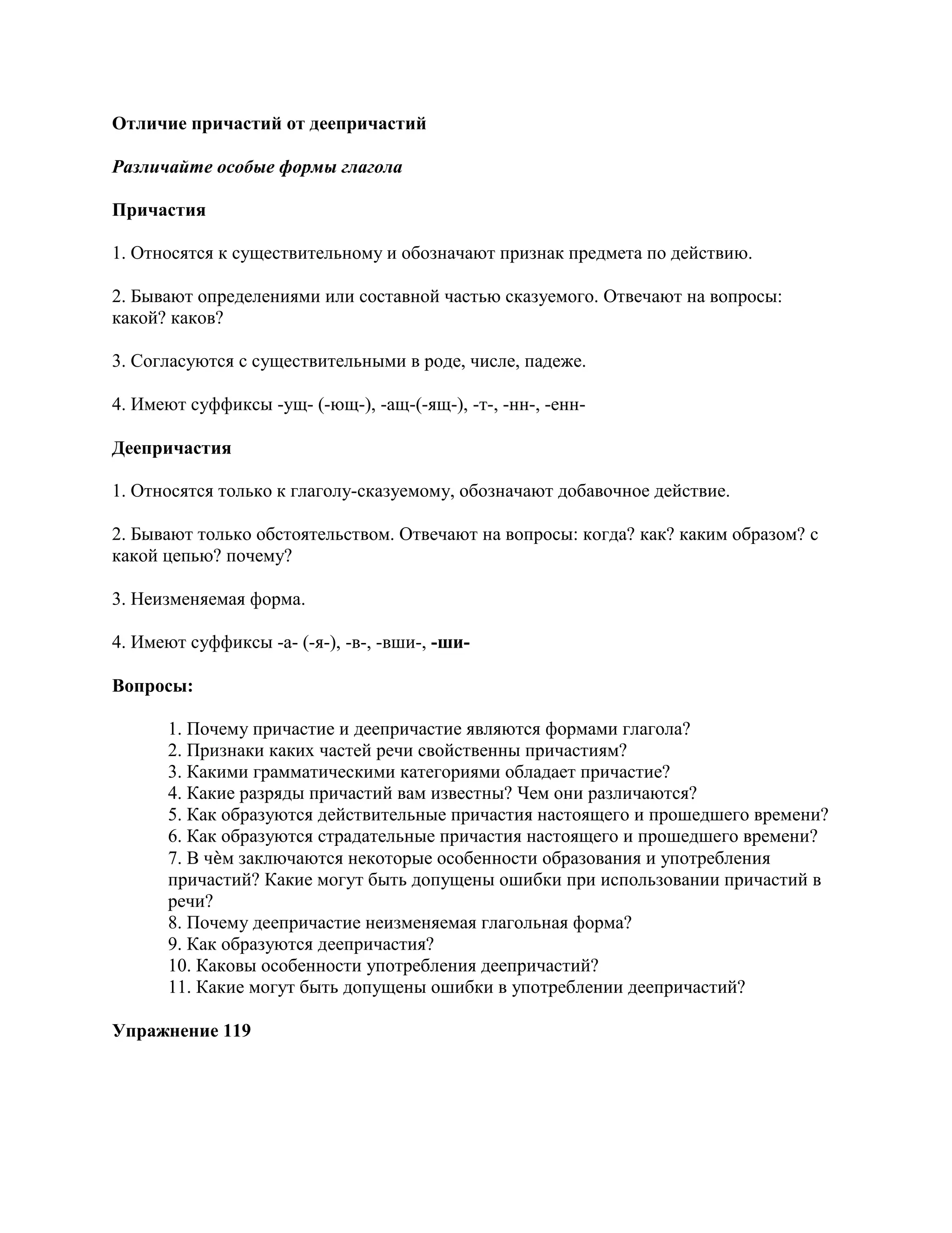 Документ описывает различия между причастиями и деепричастиями, их грамматические признаки и функции в языке. Он содержит примеры, вопросы и упражнения для закрепления материала об этих формах глагола. Также обсуждаются ошибки, допускаемые при их использовании.