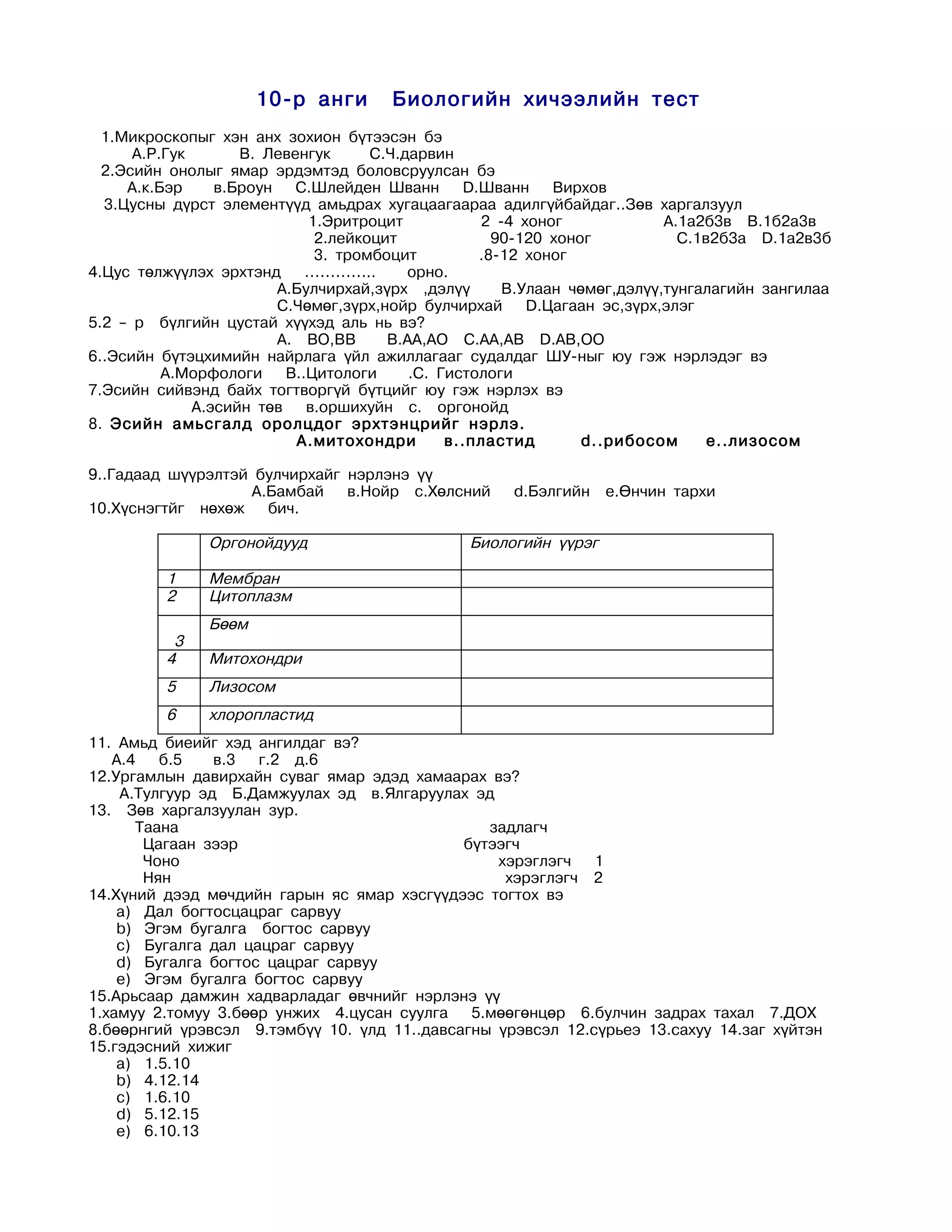 10-Р АНГИЙН БИОЛОГИЙН ХИЧЭЭЛИЙН ДААЛГАВАР