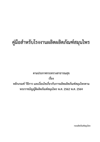 คู่มือสำหรับโรงงานผลิตผลิตภัณฑ์สมุนไพร ตามประกาศกระทรวงสาธารณสุข เรื่อง หลักเกณฑ์ วิธีการ และเงื่อนไขเกี่ยวกับการผลิตผลิตภัณฑ์สมุนไพรตาม พระราชบัญญัติผลิตภัณฑ์สมุนไพร พ.ศ. 2562 พ.ศ. 2564